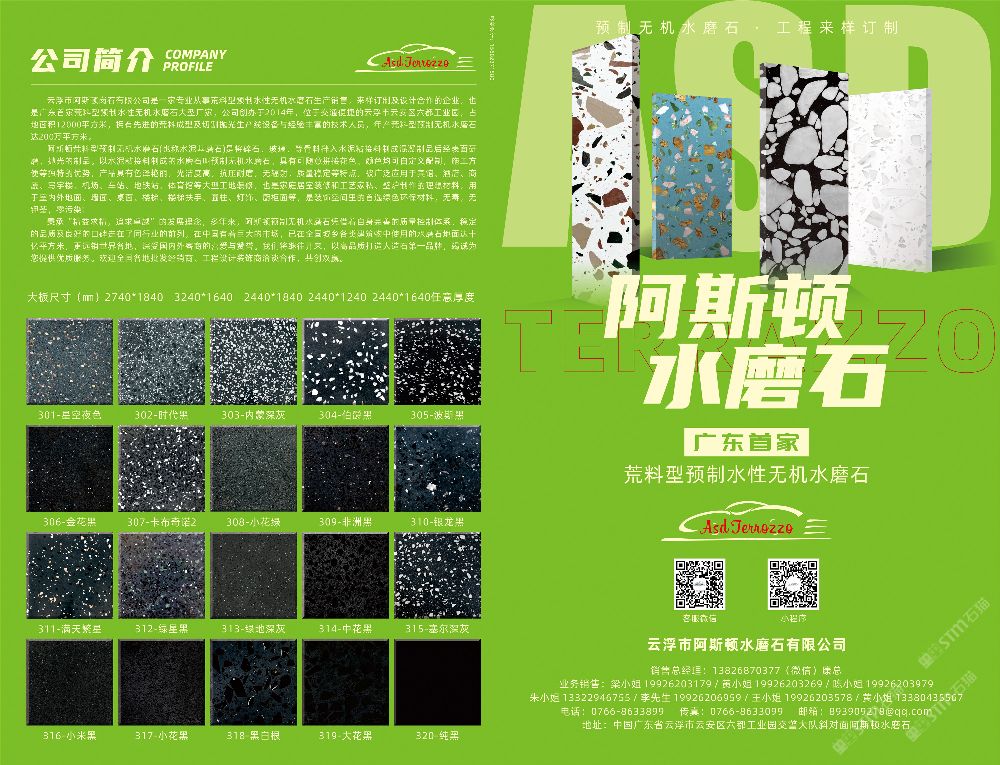廣東省云浮市阿斯頓水磨石有限公司創(chuàng)辦于2014年,是一家集研發(fā)生產(chǎn)設(shè)計(jì)定制銷售于一體的專業(yè)水磨石生產(chǎn)廠家,公司近年來迅速的發(fā)展,規(guī)模不斷擴(kuò)大,工廠生產(chǎn)基地位于云城區(qū)格木橋轉(zhuǎn)移基地三期興旺大道,其占地面積12000平方米,旗艦展館占地面積5000 平方米,擁有先進(jìn)的荒料成型及切割拋光生產(chǎn)線設(shè)備,年產(chǎn)水磨石達(dá)200萬平方米,現(xiàn)貨常年庫存15-20萬平方米。 \\\