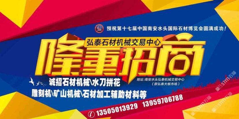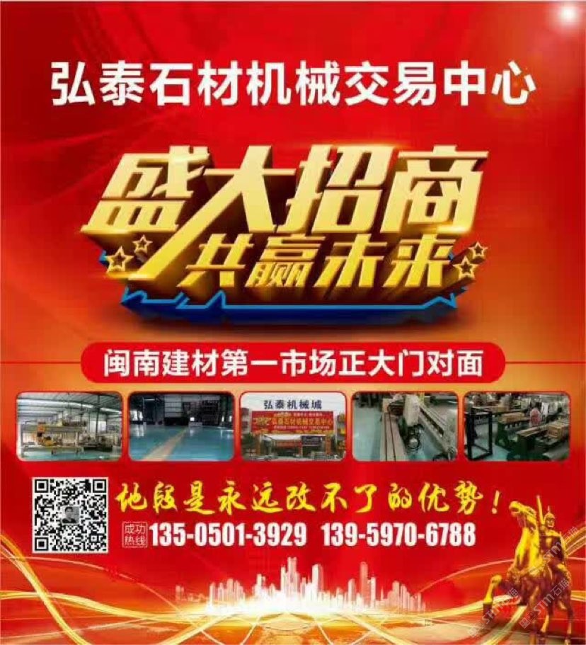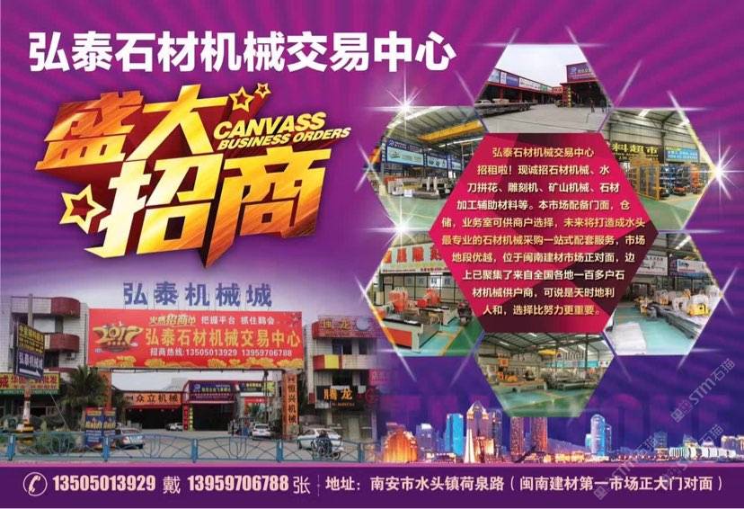 弘泰石材機(jī)械交易中心招租啦!現(xiàn)誠(chéng)招石材機(jī)械、水刀拼花、雕刻機(jī)、礦山機(jī)械、石材加工輔助材料等。本市場(chǎng)配備門(mén)面,倉(cāng)儲(chǔ),業(yè)務(wù)室可供商戶(hù)選擇,未來(lái)將打造成水頭專(zhuān)業(yè)的石材機(jī)械采購(gòu)一站式配套服務(wù),市場(chǎng)地段優(yōu)越,位于閩南建材市場(chǎng)正對(duì)面,邊上已聚集了來(lái)自全國(guó)各地一百多戶(hù)石材機(jī)械供戶(hù)商,可說(shuō)是天時(shí)地利人和,選擇比努力更重要。