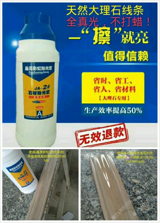 (晶亮彩虹拋光漿)為配方調(diào)制。從2016年5月份開始靠著技術(shù)員親自逐間上門到云浮多家石材工藝廠施展產(chǎn)品使用技術(shù)和試驗(yàn)產(chǎn)品光度效果取得了各家老板和工藝師們的稱贊和認(rèn)可,通過短短一年的時(shí)間品牌:晶亮彩虹拋光漿全國省地已約2000家石材廠正在使用,市場(chǎng)反應(yīng)效果顯注,現(xiàn)面向全國誠招代理商??头峋€:15876619079
