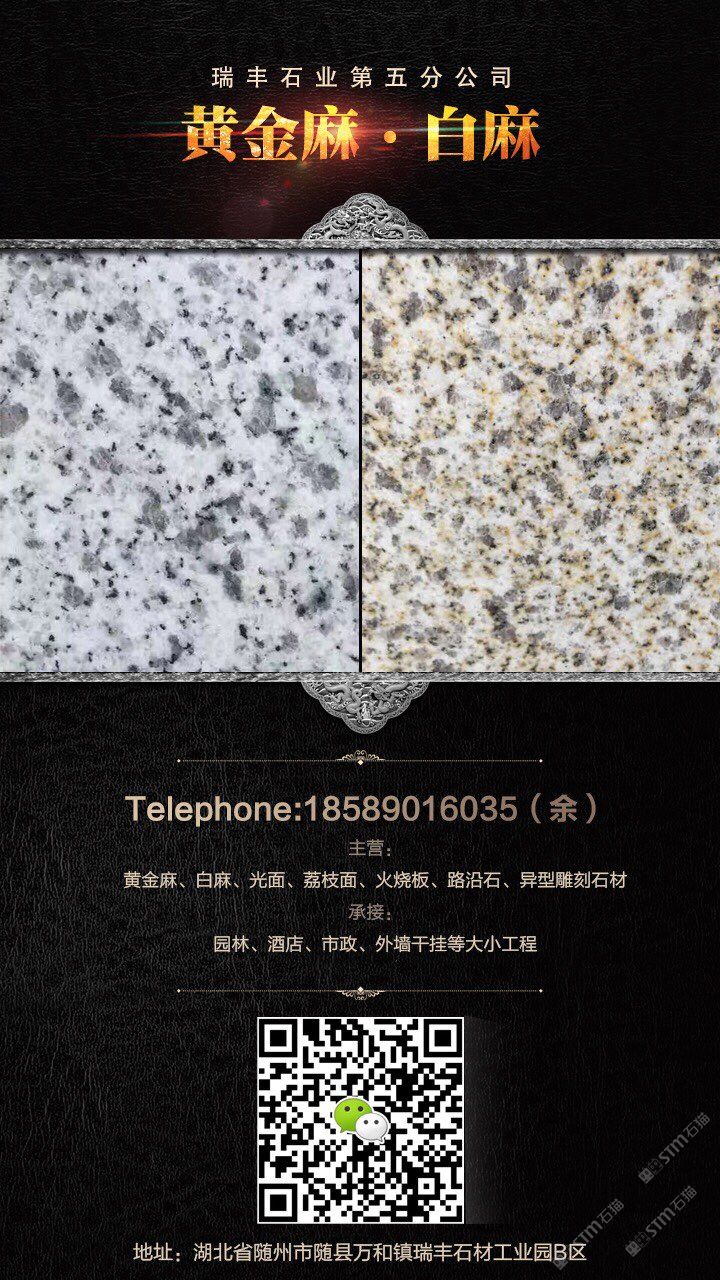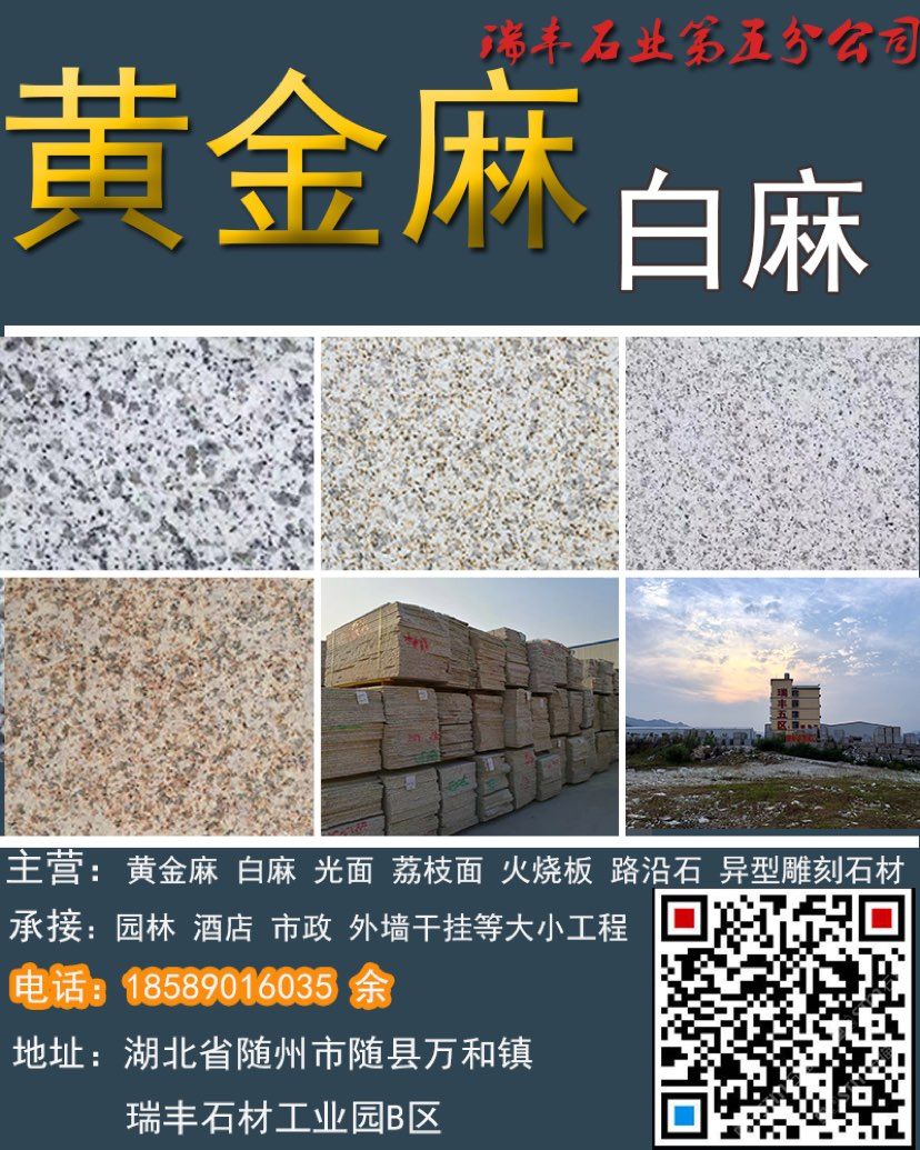 礦廠直銷;黃金麻,白麻,路沿石,蘑菇石,火燒面,光面,荔枝面,機(jī)切面,自然面,異形加工等各種規(guī)格板材。承接園林,廣場外墻干掛等各種工程應(yīng)用板材。規(guī)格齊全,保質(zhì)保量,歡迎新老客戶來電下單。18589016035