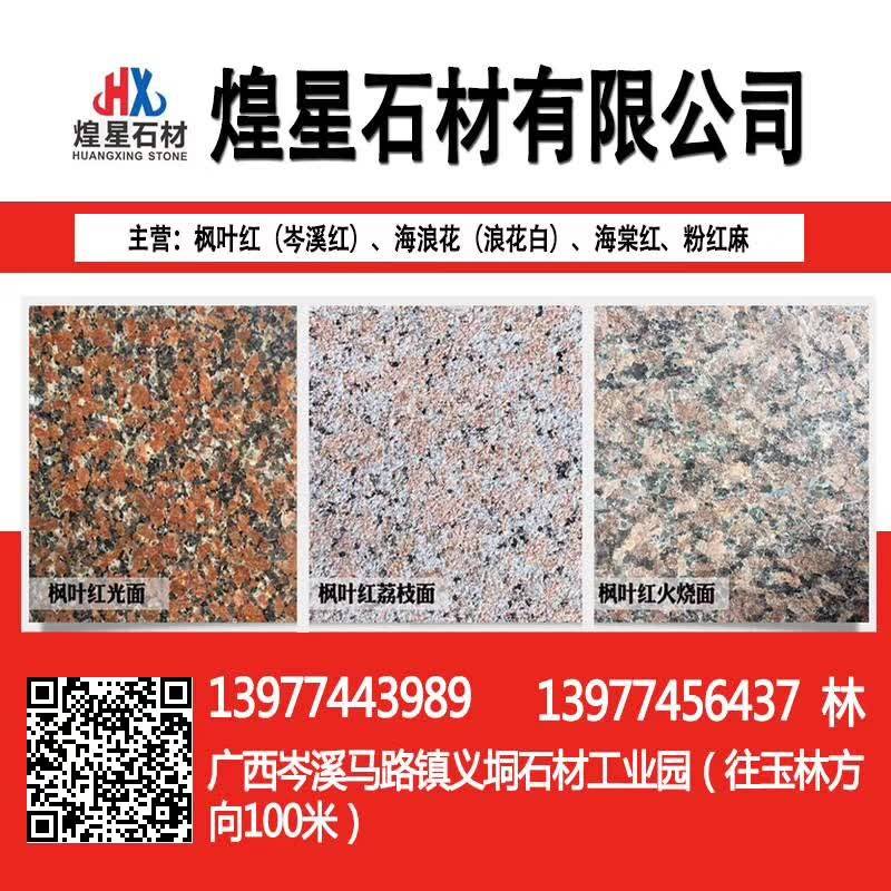岑溪市煌星石材位于岑溪市馬路鎮(zhèn)義垌石材工業(yè)園,主要生產(chǎn)銷售:岑溪紅(楓葉紅),海浪花,海棠紅,三堡紅,粉紅麻,鐘山青,光板,毛板,火燒板,荔枝面,路沿石,異形板,大板以及各種工程板。\\\\\\\\\\\\\\\