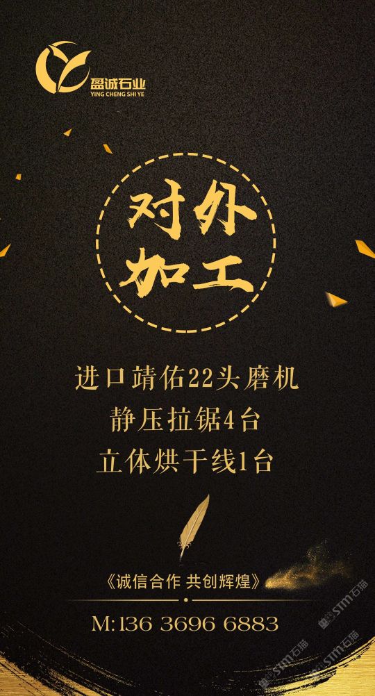 加工廠內(nèi)設(shè)進口靖佑22頭磨機,靜壓拉鋸4臺,立體烘干線1臺。5臺快鋸、16頭自動磨、3臺中切機、雙層補板線及烘干線、紅外線橋切、倒角磨邊機械、大型工程深加工,集設(shè)計、銷售,加工一體化流水式作業(yè)。承接外墻干掛、園林鋪地、異形加工、條板批發(fā)及出口訂單。本公司一直堅持從礦山源頭把關(guān),為客戶爭取更大的品質(zhì)與優(yōu)勢