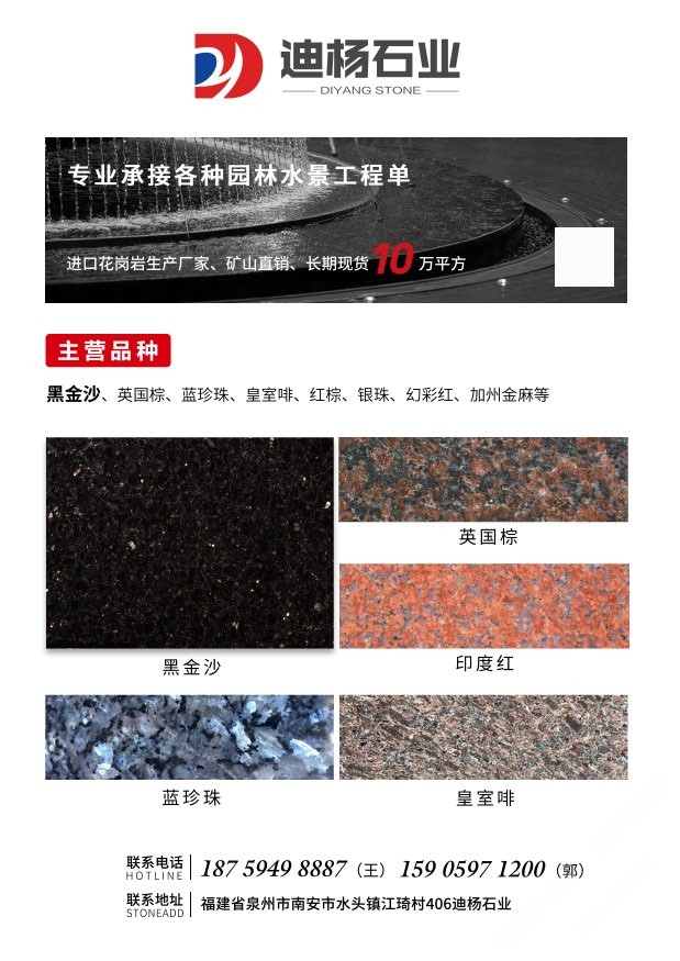 迪楊石業(yè)是一家專營進口花崗巖,集石材加工銷售工程及出口貿(mào)易為一體的,主營黑金沙,印度紅,皇室啡,英國棕,綠星,銀珠,金鉆麻等各種進口花崗巖,可承接外墻干掛,園林水景,地鋪家裝等各種異形加工,各種尺寸規(guī)格的大小工程單。歡迎來電咨詢