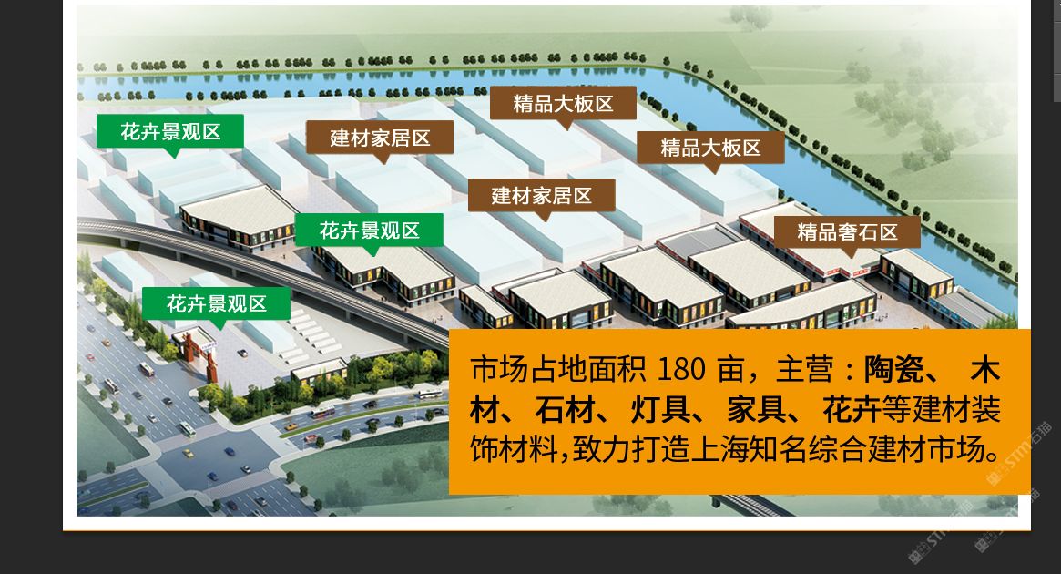 曹安路20年成熟市場,公司自有房產(chǎn)證,地處國際汽車城安亭鎮(zhèn),11號線國際汽車城站200米,附近住宅密集。自2000年開業(yè)以來,已吸引各地300多家廠商入駐,市場運營數(shù)十年,區(qū)域功能日臻完善,形成以陶瓷、衛(wèi)浴、木材、石材、家居等聚集區(qū),打造一站式建材家居市場,全方位建材體驗中心。 現(xiàn)增設石材精品館,石材采購基地。