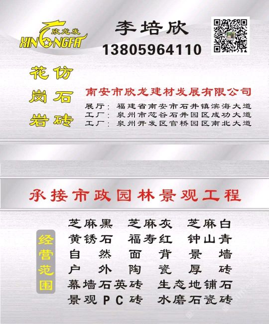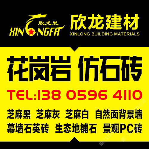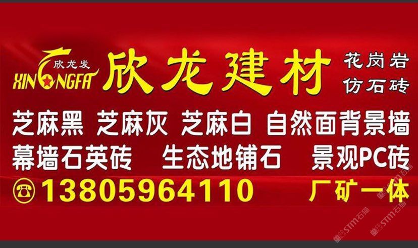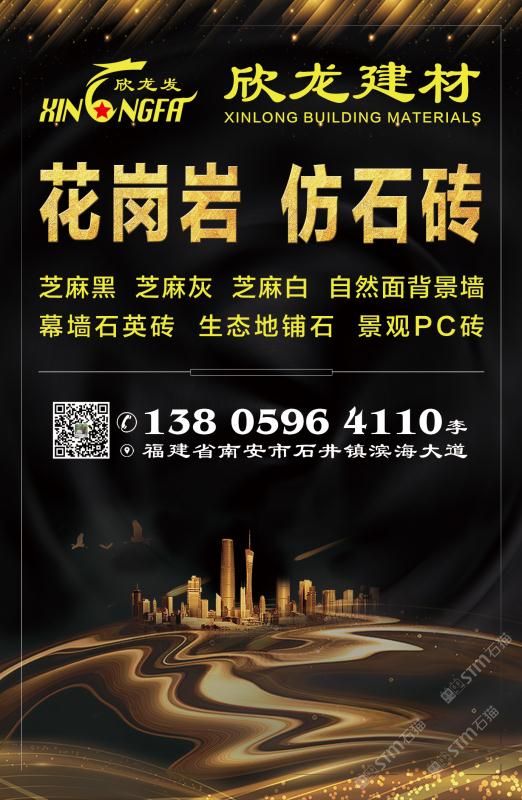 南安市欣龍建材發(fā)展有限公司,位于建材之鄉(xiāng)—福建省南安市石井鎮(zhèn),公司旗下?lián)碛袃纱笾髁Ξa(chǎn)品:花崗巖?仿石磚。(一)花崗巖:廠礦一體,荒料?大板?成品精加工,一站式供應(yīng)。擁有芝麻黑、芝麻灰、芝麻白、銹石、蝦紅、小藍(lán)寶、藍(lán)寶石、泉州紅、永定紅、福壽紅、福建青、鐘山青、喬治亞灰、G606、G617等品種,承接幕墻干掛、園林景觀、市政廣場、機(jī)場高鐵、別墅豪裝、酒店精裝、異形雕刻、自然面背景墻等工程。為石而生,匯聚石尚生活! (二)仿石磚:戶外陶瓷厚磚,接受客戶需求定制。不是石材,更勝石材!抗壓強(qiáng)度高、抗凍性能好、防滑耐磨、綠色環(huán)保。擁有幕墻石英磚、生態(tài)地鋪石、景觀PC磚、環(huán)保熔巖板、陶瓷透水磚、水泥PC磚等系列產(chǎn)品。采用先進(jìn)的技術(shù)與工藝,融匯東西方精粹,不斷創(chuàng)新,將不同文化風(fēng)尚及搭配方式重新組合設(shè)計(jì),開發(fā)現(xiàn)代新穎的產(chǎn)品,造就逼真無瑕的自然外觀質(zhì)感,滿足全球客戶不斷發(fā)展的個(gè)性化需求。產(chǎn)品廣泛應(yīng)用于園林小區(qū)、商業(yè)地產(chǎn)、公園廣場、市政道路、高鐵地鐵、酒店賓館、居家庭院、步行街、寫字樓、度假村、機(jī)場、學(xué)校、醫(yī)院、綠道等干掛鋪裝場所。因?yàn)閷Wⅲ詫I(yè)!