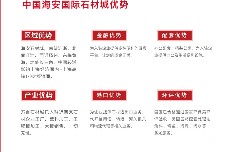 項(xiàng)目得到當(dāng)?shù)卣拇罅χС郑度牖A(chǔ)設(shè)施20億元,主干道雙向六車道已全面通車,綠化、官網(wǎng)、路燈、水電等七通一平已全部到位,達(dá)到一級城市主干道水平。石材城總占地面積15000畝,一期占地面積3000畝,規(guī)劃總建筑面積約138萬平方米,于2013年1月18日全面開工建設(shè),目前已有80多家企業(yè)正式投產(chǎn)。
