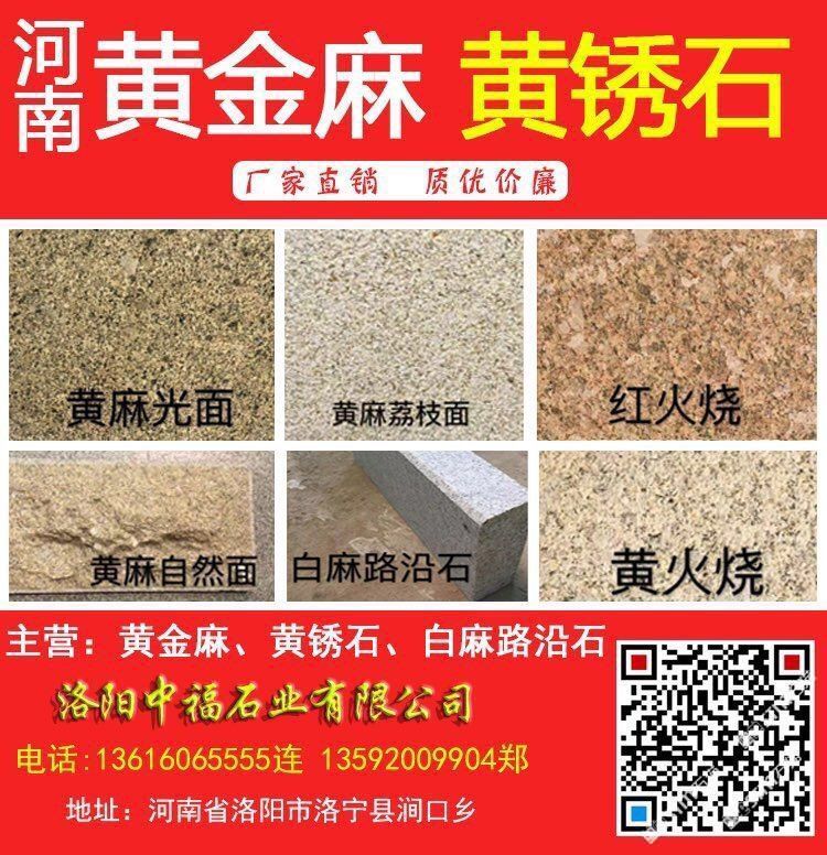 洛陽中福石業(yè)(電話:13616065555連17036286666連13592009904鄭)是河南黃金麻、河南黃銹石、河南白麻、河南芝麻白、角美銹、龍海銹、漳浦銹、g682石材、g682花崗巖、黃金麻花崗巖、黃金麻石材、黃色石材、黃色花崗巖、荒料、路沿石、墓碑石、工程面板、異型加工、芝麻黑廠家、花崗巖石材、幕墻石材、干掛板、馬路牙子、水溝蓋板、花圍樹圍、荔枝面、火燒面、磨光面花崗巖板材等產(chǎn)品專業(yè)生產(chǎn)加工的工廠,擁有完整、科學(xué)的質(zhì)量管理體系。洛陽中福石業(yè)有限公司的誠(chéng)信、實(shí)力和產(chǎn)品質(zhì)量獲得業(yè)界的認(rèn)可。歡迎各界朋友蒞臨參觀、指導(dǎo)和業(yè)務(wù)洽談。河南黃麻光面河南黃麻荔枝面河南紅火燒河南黃麻自然面河南白麻路沿石/道牙石/路緣石/路側(cè)石/鋪路石/路邊石河南黃火燒面河南黃金麻河南黃銹石/河南黃金鉆石材/河南芝麻白/河南白色花崗巖/河南白色石材/河南黃色石材/河南黃色花崗巖
