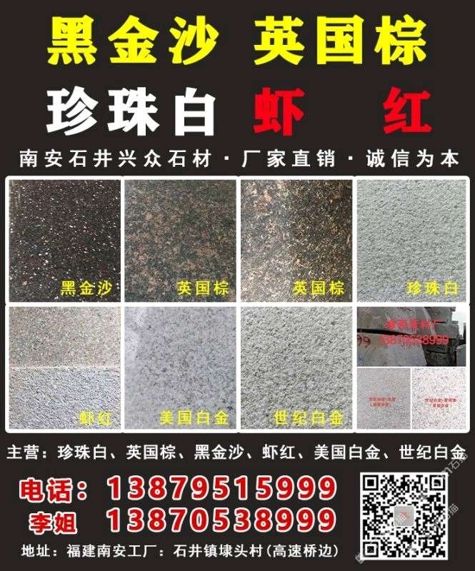 南安石井興眾石材有限公司 聯(lián)系人:李麗萍    138****8999 查看 138****8999 查看 主營范圍: 大板批發(fā)、荒料、花崗巖加工、異型加工、 企業(yè)地址:福建泉州工廠:石井鎮(zhèn)埭頭村-興眾石材