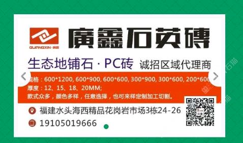 廣鑫石英磚/PC磚 聯(lián)系人:劉    134****2000 查看 手機(jī)號碼:無 主營范圍: 花崗巖加工、石材外貿(mào)、更多、環(huán)境石材、大理石加工、 企業(yè)地址:福建泉州福建省泉州市南安市水頭鎮(zhèn)海西石材城海五路1-81\\n