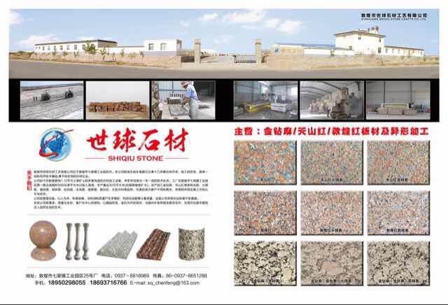 敦煌市世球工藝有限公司 聯(lián)系人:陳先生    187****9001 查看 189****8055 查看 主營范圍: 礦山、荒料、異型加工、花崗巖加工、石材工藝品、 企業(yè)地址:甘肅酒泉敦煌七里鎮(zhèn)工業(yè)園區(qū)25號(hào)廠