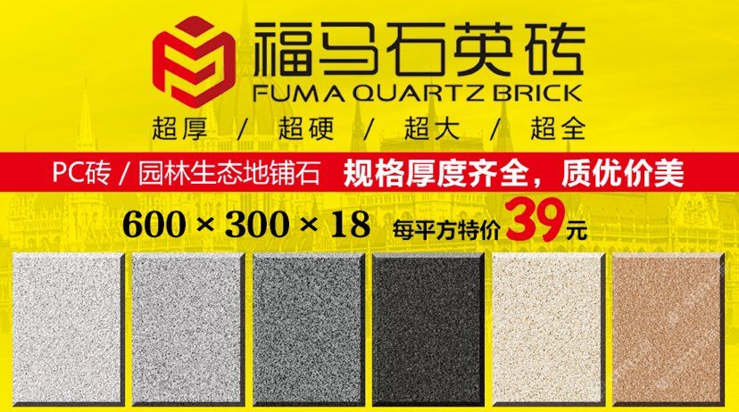發(fā)布信息: 福馬石英磚? 品質(zhì)承諾:無(wú)色差、無(wú)裂痕、不褪色、不變形、不吸水、不膨脹。 適合用于室內(nèi)外,景觀,庭院、圍墻,地鋪,干掛外墻。歡迎新老客戶來(lái)選購(gòu),品種多,規(guī)格全