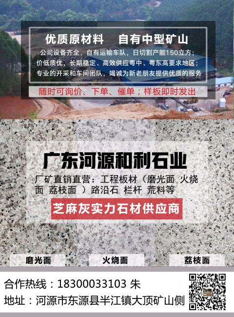 發(fā)布信息: 廠礦直銷廣東省河源市新礦芝麻灰, 部分庫存貨路沿石低至980元立方; 主營:規(guī)格板材、路沿石、欄河等。 常規(guī)700頭路沿石含運(yùn)費(fèi)至河源地區(qū)約1350~1380元/立方,至惠州地區(qū)約1380~1400元/立方,至深圳、廣州、東莞、清遠(yuǎn)潮汕地區(qū)約1400~1450元/立方等; 2.5厚300*600火燒板至河源地區(qū)約55元/平方,惠州地區(qū)約57元/平方,至深圳、廣州、東莞、清遠(yuǎn)潮汕地區(qū)約58元/平方等; 市政常規(guī)欄河包材料與安裝價格約430~480元/米; 承接:市政,園林,廣場等工程應(yīng)用石材,熱誠歡迎各界朋友前來參觀,考察,洽談業(yè)務(wù),期待您的咨詢。 自有礦山,廠礦直銷,無中介,質(zhì)量,價格合理。 廠址:河源市東源縣半江鎮(zhèn)大頂?shù)V山內(nèi) 電話:18300033103 朱