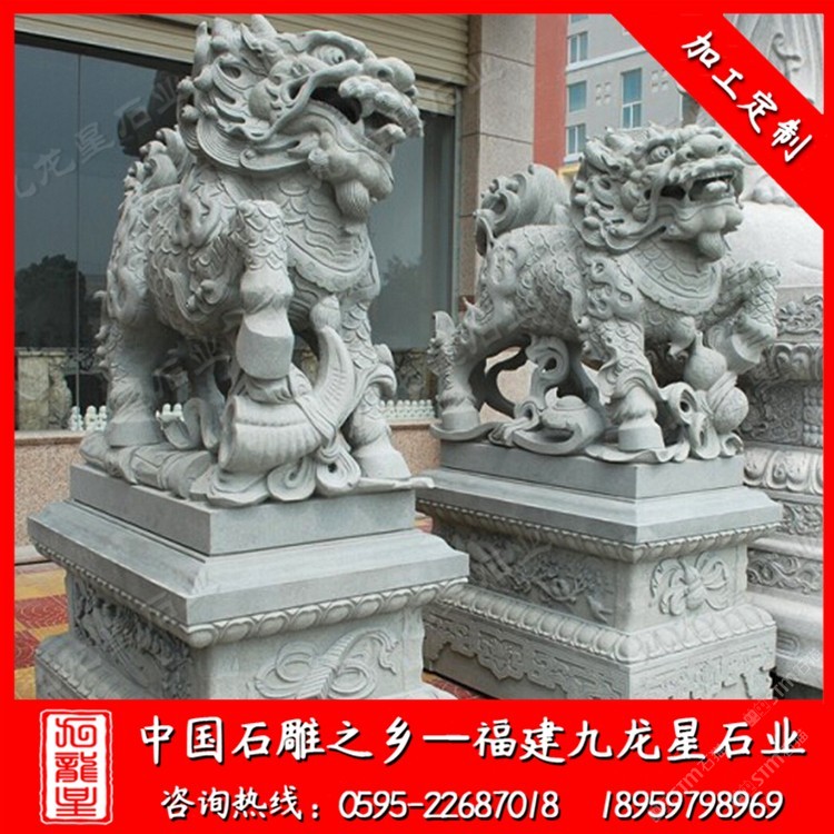 發(fā)布信息: 麒麟神獸石雕廠家——九龍星石業(yè)18959798969 一對石雕麒麟雕像圖片我們經(jīng)常在網(wǎng)絡(luò)上看到。石雕麒麟雕像的表現(xiàn)形式有多,麒麟石雕從形式上有分為:圓雕、浮雕、透雕、線雕等等。 每一對石雕麒麟雕像的造型特征各有不同,石雕麒麟雕像的規(guī)格大小隨著用途也有很多尺寸規(guī)格。 石雕麒麟雕像自古來有風(fēng)shui寓意,擺放一對石雕麒麟在大門口有著很好的寓意。因此,很多人會購買石雕麒麟擺放在門口,這也就有了我們現(xiàn)在經(jīng)常在酒店門口、工廠門口、公司門口、銀行門口等地方看到一對石雕麒麟雕像。大門口通常擺放的是一對3米高的石雕麒麟雕像,或者2.5米的石雕麒麟。