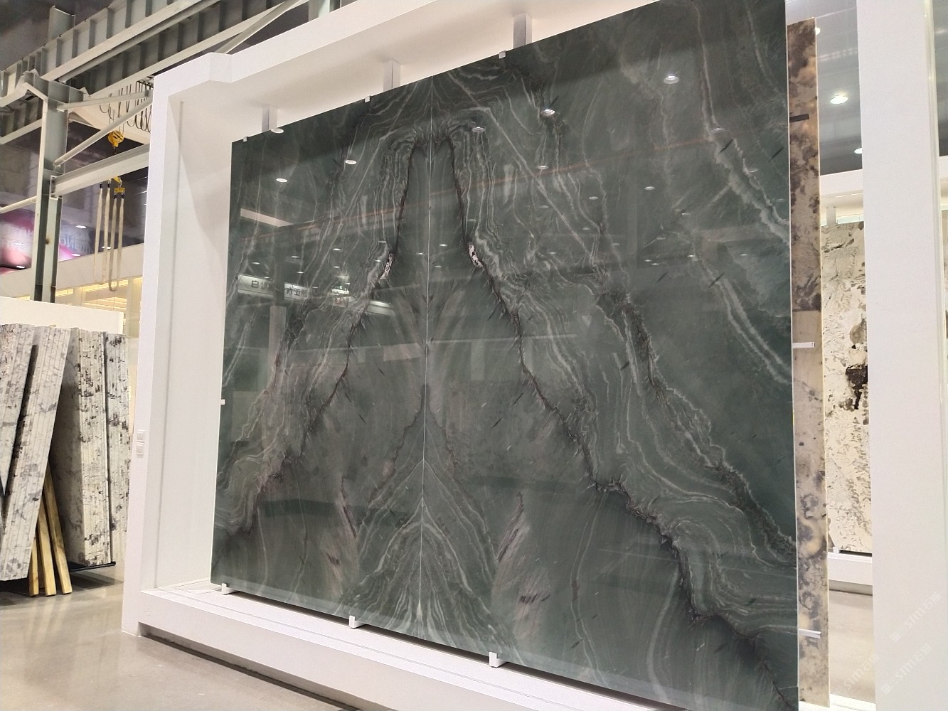 新正大奢石館[奢石品牌]龍紋綠背景墻山水畫。