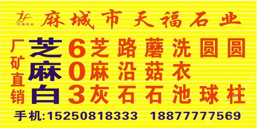 發(fā)布信息: 天福石業(yè)【主營經(jīng)營】芝麻白(603#)、卡麥黃.602#.芝麻灰、銹石、黃金麻、卡拉麥里金·毛板、光板、火燒板,荔枝面成品板及臺階石、蘑菇石~路沿石、擋車石,圓球.圓柱.異形、仿形加工工藝品等。適合用于各種場合, 優(yōu)質(zhì)礦山資源以質(zhì)量求生存、以信譽求發(fā)展。聯(lián)系電話:15250818333