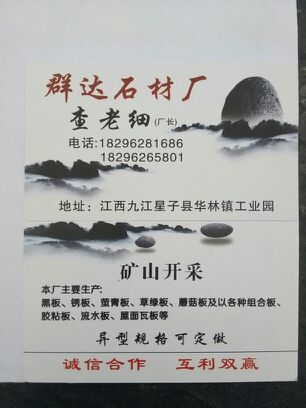 九江達(dá)方石材有限公司主營(yíng)產(chǎn)品:黑板巖,綠板巖,青石(板巖),硅質(zhì)瓦板巖,幻彩板巖,文化石(蘑菇石),文化石(平板),文化石(網(wǎng)貼),自然面背景墻,汀步石,文化石(流水石/流水墻),文化石(碎拼/散片石),文化石(腳踏石),景觀石(黑山石),鵝卵石,景觀石(黃蠟石),老石板(舊石板),路沿石/花壇石,地鋪石(冰裂紋),地鋪石(小方塊)企業(yè)地址:江西九江星子縣