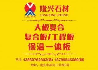 隆興復(fù)合板主營(yíng)產(chǎn)品:復(fù)合板(保溫石材),復(fù)合板(大理石鋁蜂窩),復(fù)合板(大理石花崗巖復(fù)合),復(fù)合板(玉石玻璃),復(fù)合板(大理石瓷磚),復(fù)合板(超?。?復(fù)合板(奢石),透光復(fù)合板(光電奢石)企業(yè)地址:福建南安石井鎮(zhèn)蘇內(nèi)工業(yè)區(qū)8號(hào)